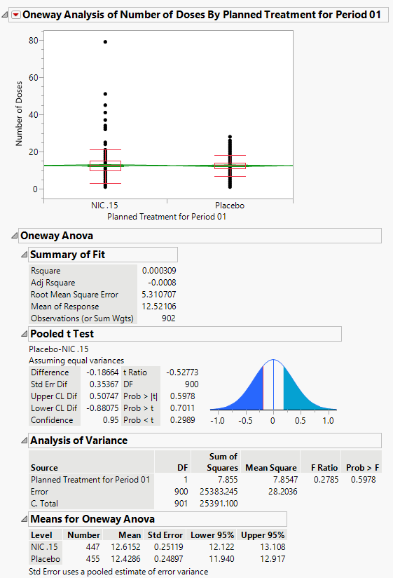This report performs aone-way ANOVA (analysis of variance) to detect statistical differences for the number of doses subjects in each treatment arm.