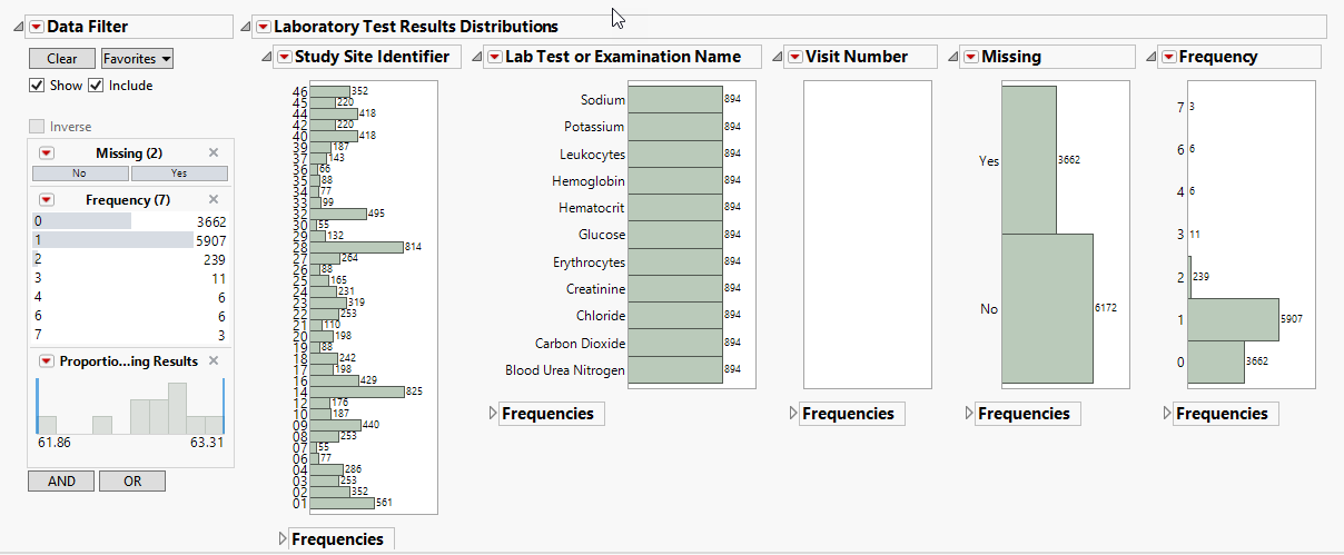 Displays histograms showing distribution of laboratory test findings across study sites, tests, and visit numbers, as well as the frequencies of records with either available or missing results.