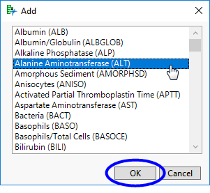 In this example, Alanine Aminotransferase (ALT) was selected and added.