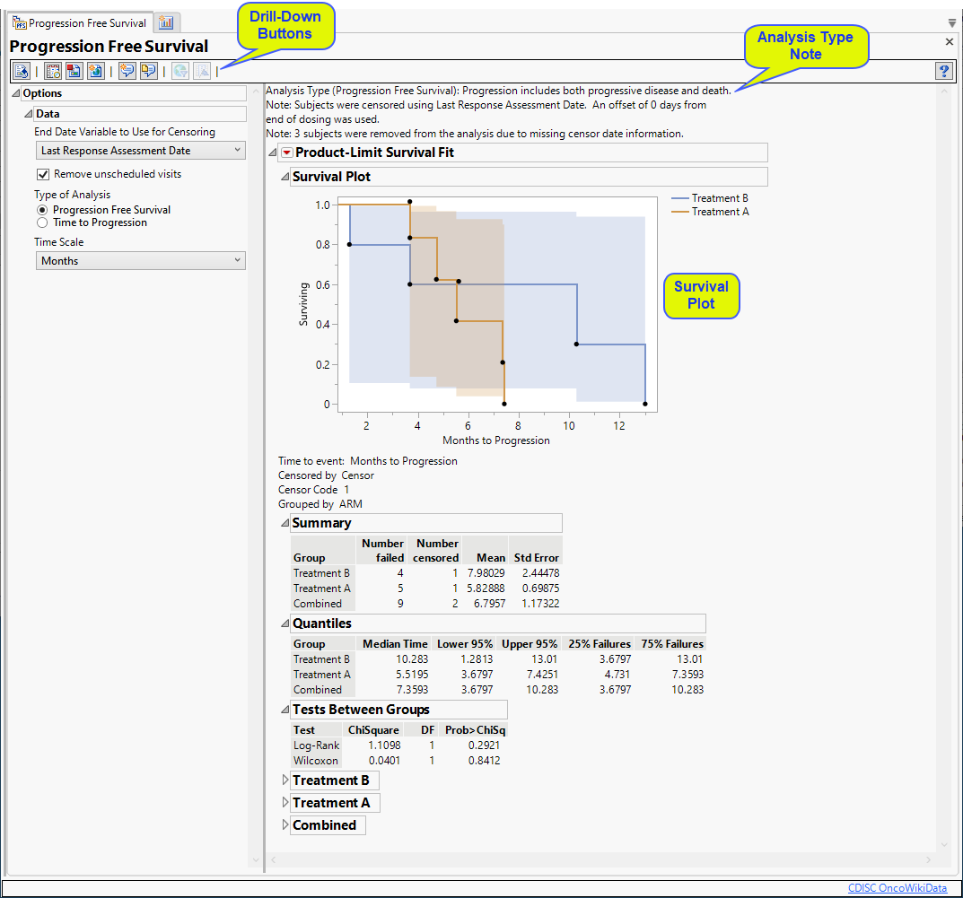 The Type of Analysis widget enables you to specify whether you want to measure Progression Free Survival or Time to Progression. Progression free survival measures the time from patient randomization to either tumor progression or death. Time to progression censors death and only considers objective tumor progression. A note is added to the top of the report indication which type of analysis has been selected.