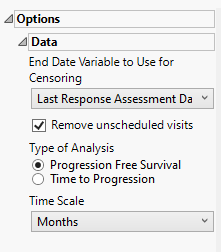 For patients who survive progression-free beyond the end of the study, the ultimate progression-free survival values for these individuals are unknown. All that can be said is that progression-free survival exceeds the period of the study; these data are considered censored. For these cases, you must specify the end date for collecting data to assess progression. The End Date Variable to Use for Censoring option is used to select which variable date reference from the demography domain to use for calculating the censored disease progression values. Patients who progress after this date are not considered as progressing. The Last Response Assessment Date is chosen by default.