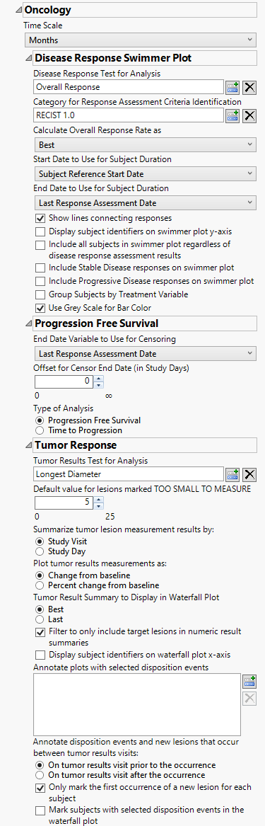 For patients who survive progression-free beyond the end of the study, the ultimate progression-free survival values for these individuals are unknown. All that can be said is that progression-free survival exceeds the period of the study; these data are considered censored. For these cases, you must specify the end date for collecting data to assess progression. The End Date Variable to Use for Censoring widget is used to select which variable date reference from the demography domain to use for calculating the censored disease progression values. Patients who progress after this date are not considered as progressing. The Last Response Assessment Date is chosen by default.