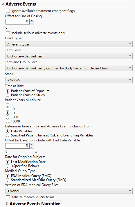 Use the Determine Time at Risk and Adverse Event inclusion from: widget to specify whether JMP Clinical should calculate patient years and event inclusion based on study date variables or from derived patient years/time at risk and event inclusion flags.
