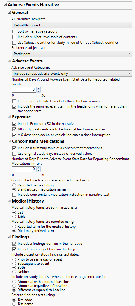You might want to include in the narrative additional events that occur at or about the same time as the reported adverse events. Use the Number of days around Adverse Event start date for reported related events option to specify the number of days before and after the onset of the adverse event, within which the additional events are considered. only those events falling within the specified time are included in the narrative.