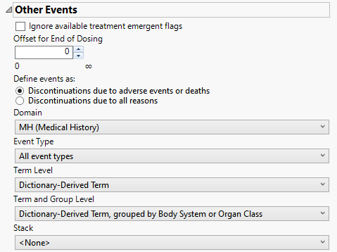 Term and Group Levels are determined by the coding dictionary for the Event or Intervention domain of interest, typically these levels follow the MedDRA dictionary. You must indicate how each adverse event is named and the level at which the event is considered. For example, selecting Reported Term for the Adverse Event, grouped by Body System or Organ Class reports the event specified by the actual event term as reported in the AE domain on the affected organ or body system.