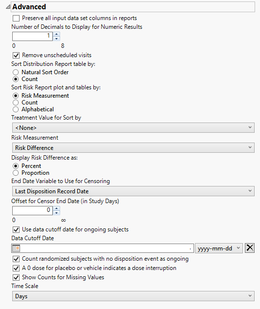 Use the End Date Variable to Use for Censoring option for specifying the end date for censoring. Options include the reference end date, date of the last treatment, the date on which the subject left the study or the date of the last disposition record (selected by default).
