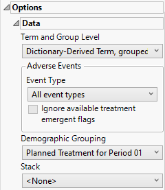 Term and Group Levels are determined by the coding dictionary for the Event or Intervention domain of interest, typically these levels follow the MedDRA dictionary. Use this widget to indicate how each adverse event is named and the level at which the event is considered. For example, selecting Reported Term for the Adverse Event, grouped by Body System or Organ Class as theTerm and Group Level reports the event specified by the actual event term as reported in the AE domain on the affected organ or body system.