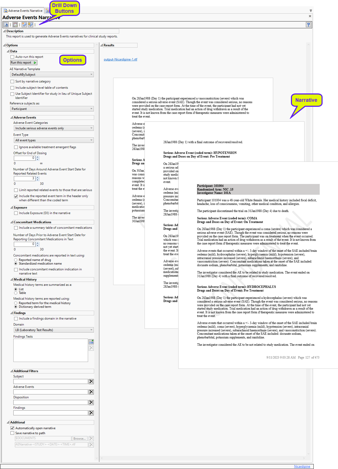 A narrative, containing descriptions of all of the observed adverse events, is generated for each patient. The narrative for the Nicardipine example is 473 pages long. In the example shown here, subject 101004 experienced 5 adverse events that are described over 3 pages.