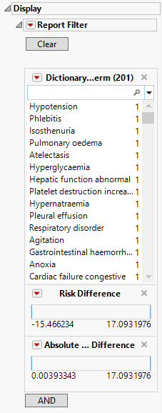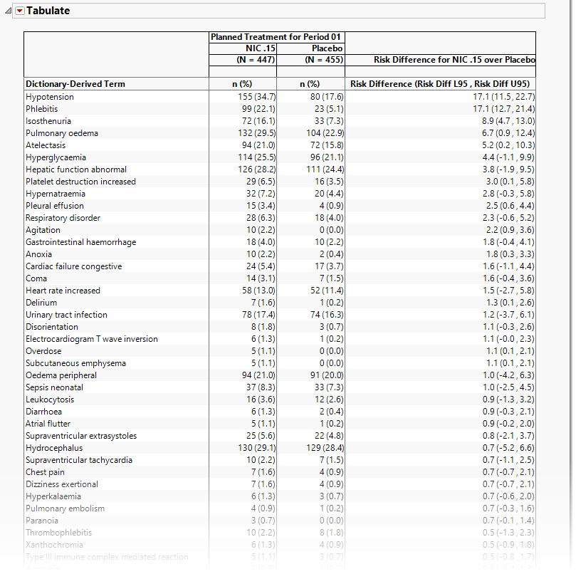 | • | The table presents an alternate view, listing the subject counts experiencing an event and the respective percent of subjects (in parentheses) on each treatment arm, as well as the risk difference and 95% confidence interval (in parentheses) for the terms (or those terms falling under selected groups, when specified). |