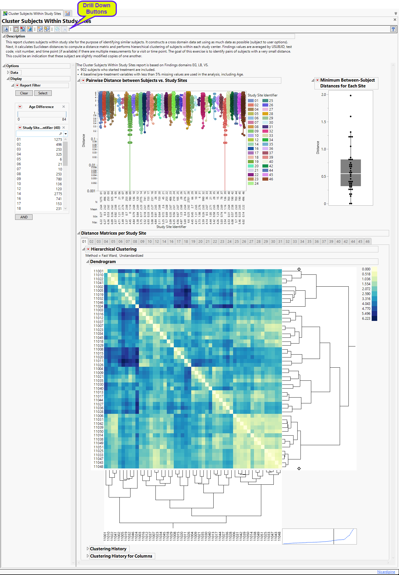 This report clusters subjects within study site for the purpose of identifying similar subjects. It constructs a cross domain data set using as much baseline data as possible (subject to user options). The dataset includes age and the variables from available findings domains (LB, EG, VS, etc.) with less than 5% missing values. Next, it calculates Euclidean distances to compute a distance matrix and performs hierarchical clustering of subjects within each study site. Findings values are averaged by USUBJID, test code, visit number, and time point (if available) if there are multiple measurements for a visit or time point. The goal of this exercise is to identify pairs of subjects with a very small distance. This could be an indication that these subject are slightly modified copies of one another.