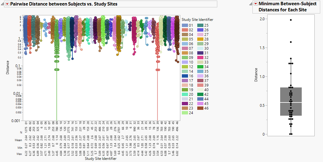 This figure shows box plots of all pairwise Euclidian distances within each study site. Individual points are overlaid with the boxplot. The Y-axis is set to log-scale by default for the ease of identifying small distance points when the range of distance is large. A summary table is shown below the boxplot presenting the N, Mean, Min, Max values for each study site. Values closer to zero (0) reflect subjects that are very similar to one another, which could indicate that they are slightly modified copies.