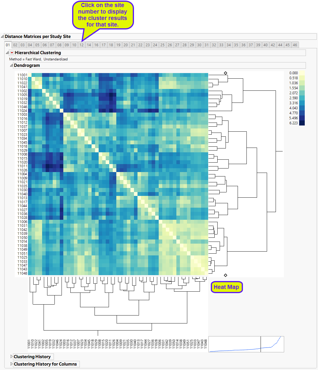 Bluer color indicates subjects that are more similar, whereas yellow shows subjects less similar. The clustering dendrogram is presented to the right of the heat map and can show sets of more than two subjects that are similar to one another. All the pairwise distance matrices, along with the subjects' ID , study sites and treatment arms, are stored in separate jmp tables, and can be accessed by clicking the 'View Tables' button.