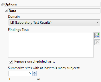 Use this widget to specify whether to plot the distribution of measurements from either the Electrocardiogram (EG), Laboratory (LB), or Vital Signs (VS) findings domains.