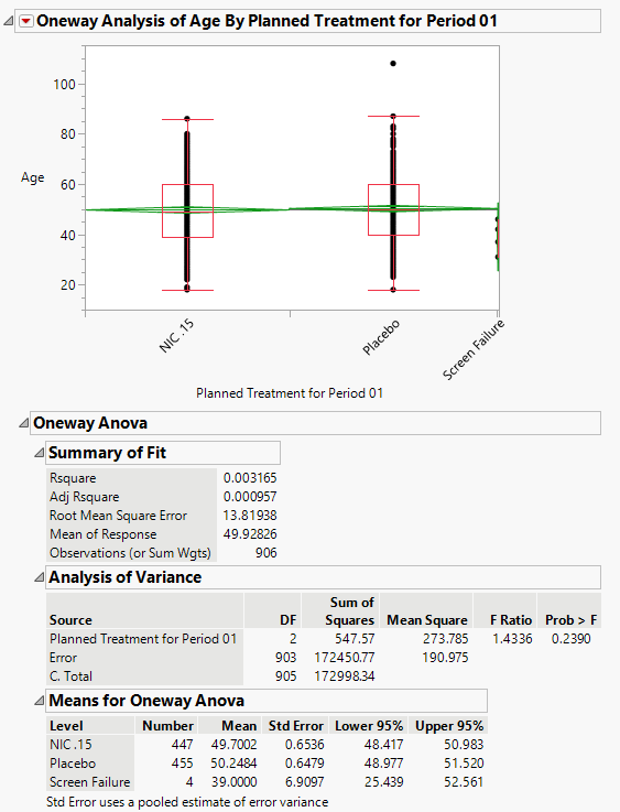 The One-way Plot above shows the distribution subjects by age for each of the two treatment arms. The analysis statistics are listed in the tables below the plot.