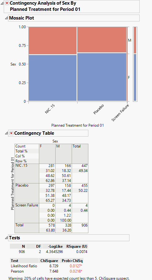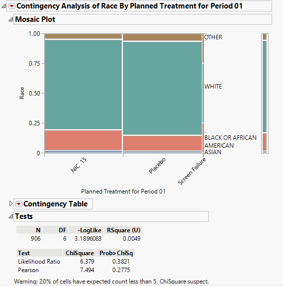 The Mosaic Plots for sex and race by treatment arm are graphical representation of a two-way frequency table or contingency table (shown below their respective plots) , divided into colored rectangles. There is one rectangle for each demographic group for each treatment arm. The area of each rectangle is proportional to the proportions of each demographic group in each treatment arm.