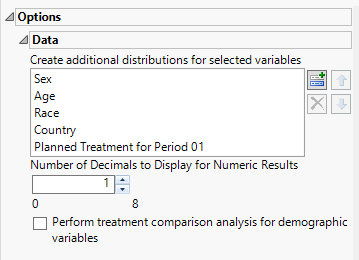 This option enables you to add or remove demographic variables from DM from the distributions.