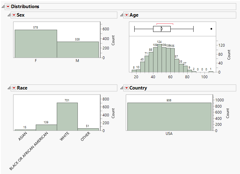 Quantiles and summary statistics are provided for continuous variables like Age, and frequencies are provided for categorical variables like Sex. These can be viewed by clicking