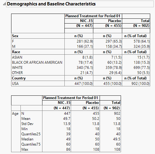 The tables in this section (shown below) summarize demographic information about the subjects in this study. The first table summarizes character data; both count and percentile data are provided by treatment arm. The second table summarizes numeric data.