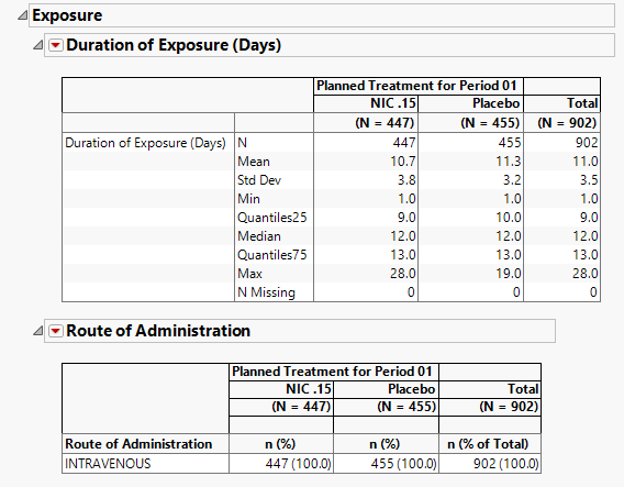 The tables in this section (shown below) summarize length of exposure by treatment arm. Treatment administration methods are also summarized.