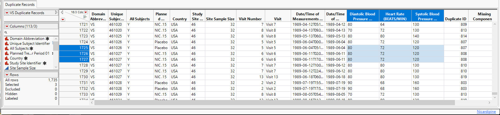 to view the duplicates in the associated data table The duplicates are highlighted). In these cases, each subject’s Diastolic Blood Pressure, BlSystolic Blood Pressure, and Heart Rate (highlighted columns) values are identical. It is unlikely to expect that these sets of values would be the same across subjects (or perhaps even repeat identically within subjects).