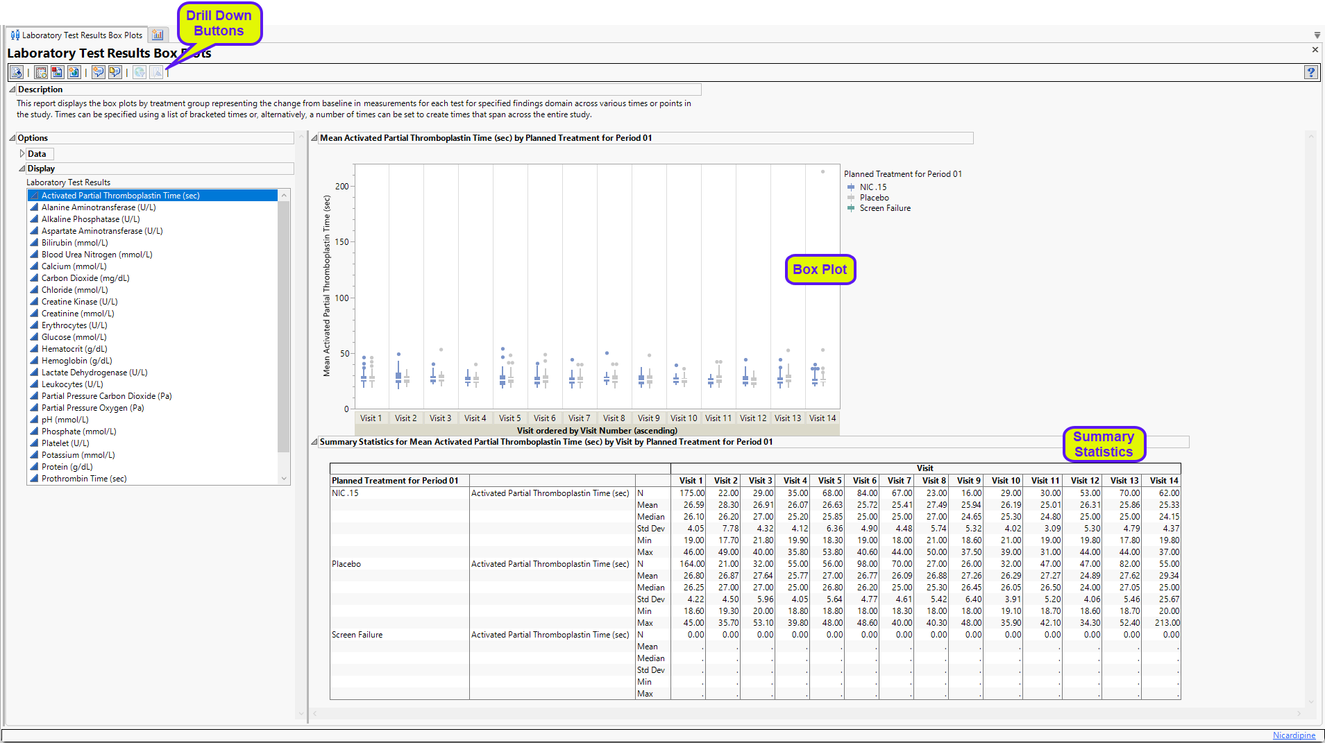 Running Findings Box Plots for Nicardipine using default settings generates the report shown below. Output from the report is organized into sections. Each section contains one or more plots, data panels, data filters, or other elements that facilitate your analysis.