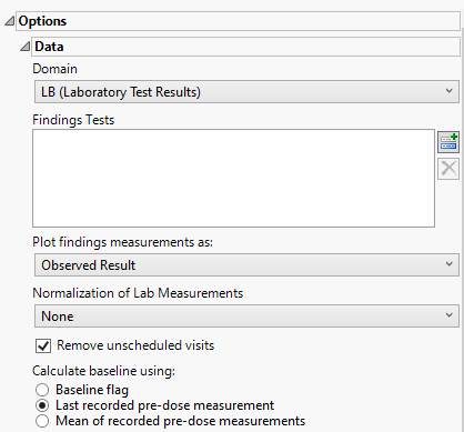 Use this widget to specify whether to plot the distribution of measurements from either the Electrocardiogram (EG), Laboratory (LB), or Vital Signs (VS) findings domains.