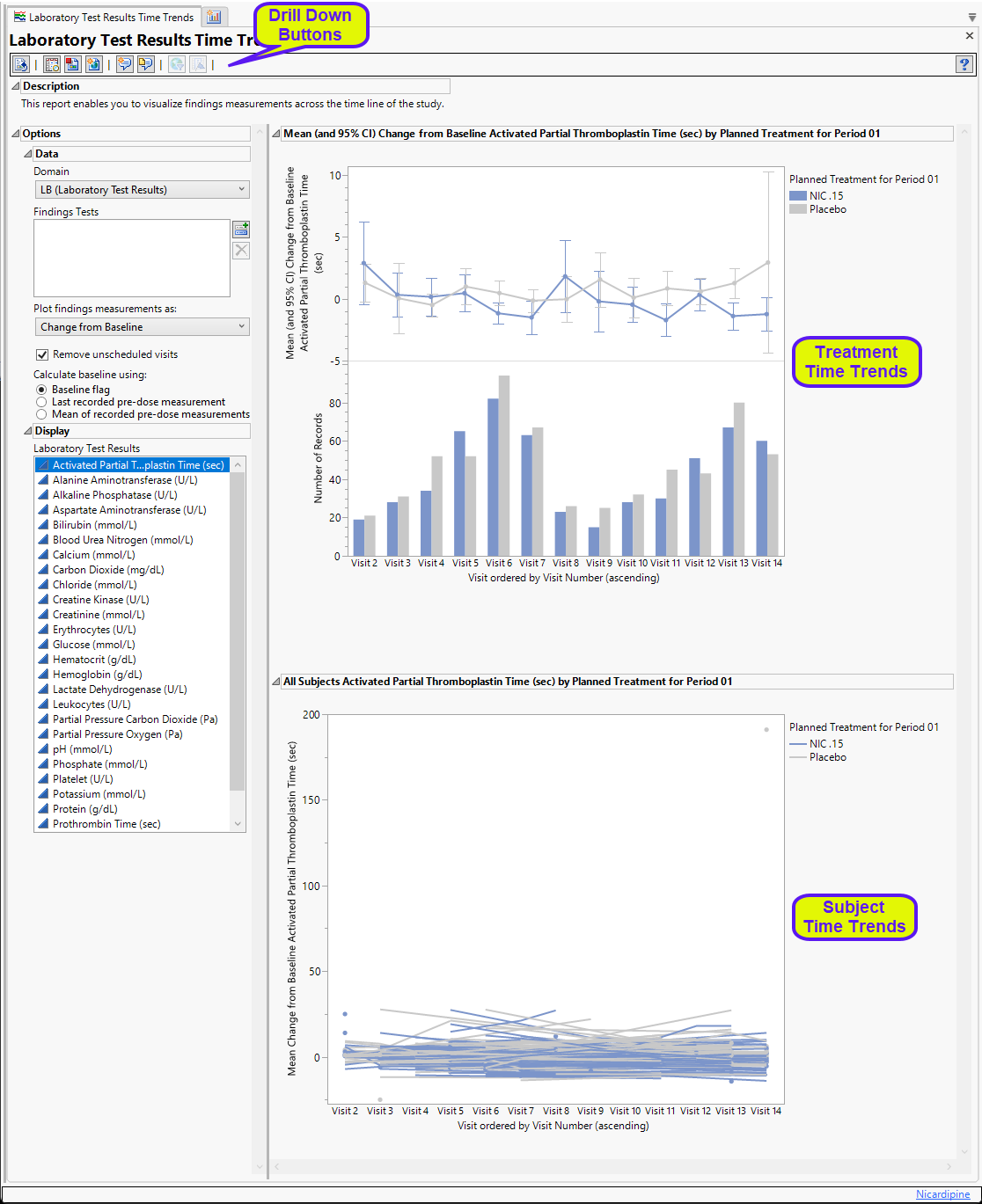 Running Findings Time Trends with the Nicardipine sample setting and LB findings domain generates the report shown below.