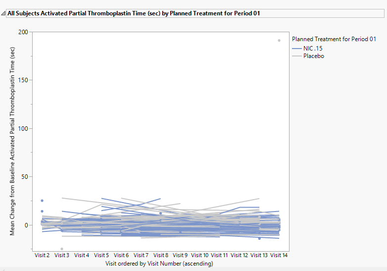 Shows a plot for each quantitative findings test (for example, laboratory) in the Findings data set that was analyzed. Each plot contains a line for each subject in the study representing the patient's measurements taken across time.