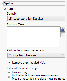 Use this widget to specify whether to plot the distribution of measurements from either the Electrocardiogram (EG), Laboratory (LB), or Vital Signs (VS) findings domains.