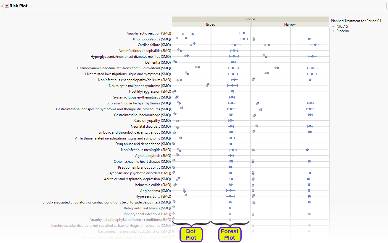 This process screens medical query terms by performing Cochran-Mantel-Haenszel (CMH) tests on all 2 x 2 tables constructed from event incidence and treatment arm. Output is a two-sided plot with a dot plot showing percent occurrence and forest plot showing risk measurement. Additionally there are 4 tables for narrow queries with dictionary-derived terms , broad queries with dictionary-derived terms, broad and narrow queries, and queries by System Organ Class (SOC).