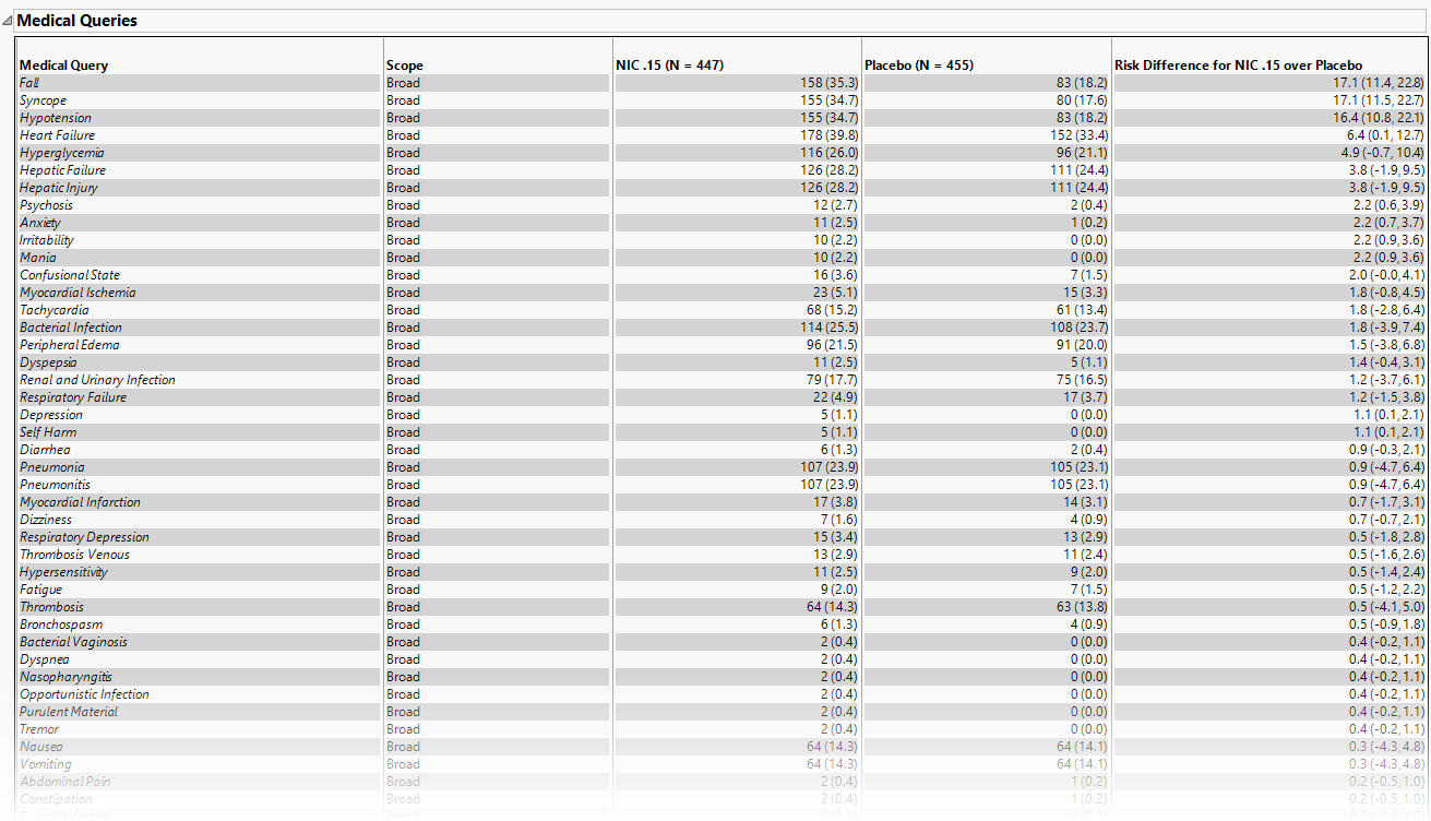 This table summarizes each query without the associated dictionary-derived terms for the number (percentile) of subjects exhibiting the event, and the risk difference between the treatment arms.