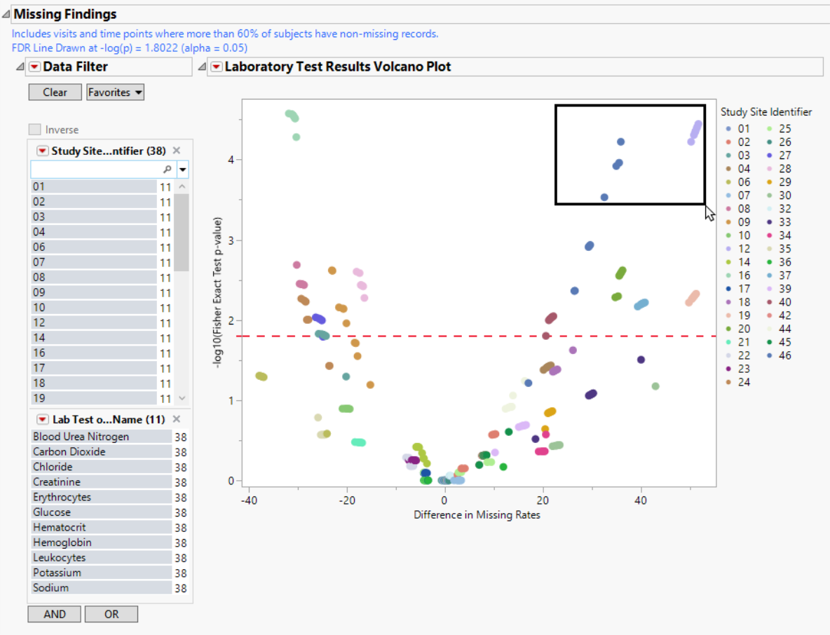 This report determines whether tests are expected or not at each visit according to dialog option (default 85%). If 85% of patients at a particular visit and/or time point have a test measured, this test is expected (assuming that the subjects have had the opportunity to attend this visit). Among expected tests and for each test, the proportion of “missingness” is calculated for each site (the suspect site, indexed with s) compared to all other sites taken together as a reference (indexed as o) using a Fisher's exact test. FDR p-values are calculated and the reference line is determined as described in How does JMP Clinical calculate the False Discovery Rate (FDR)?.