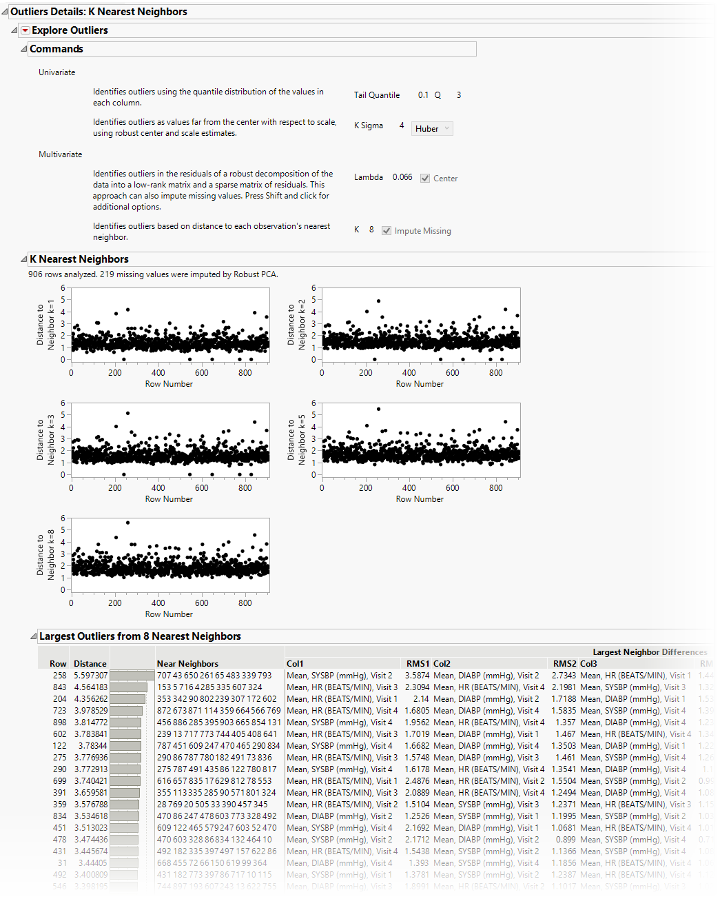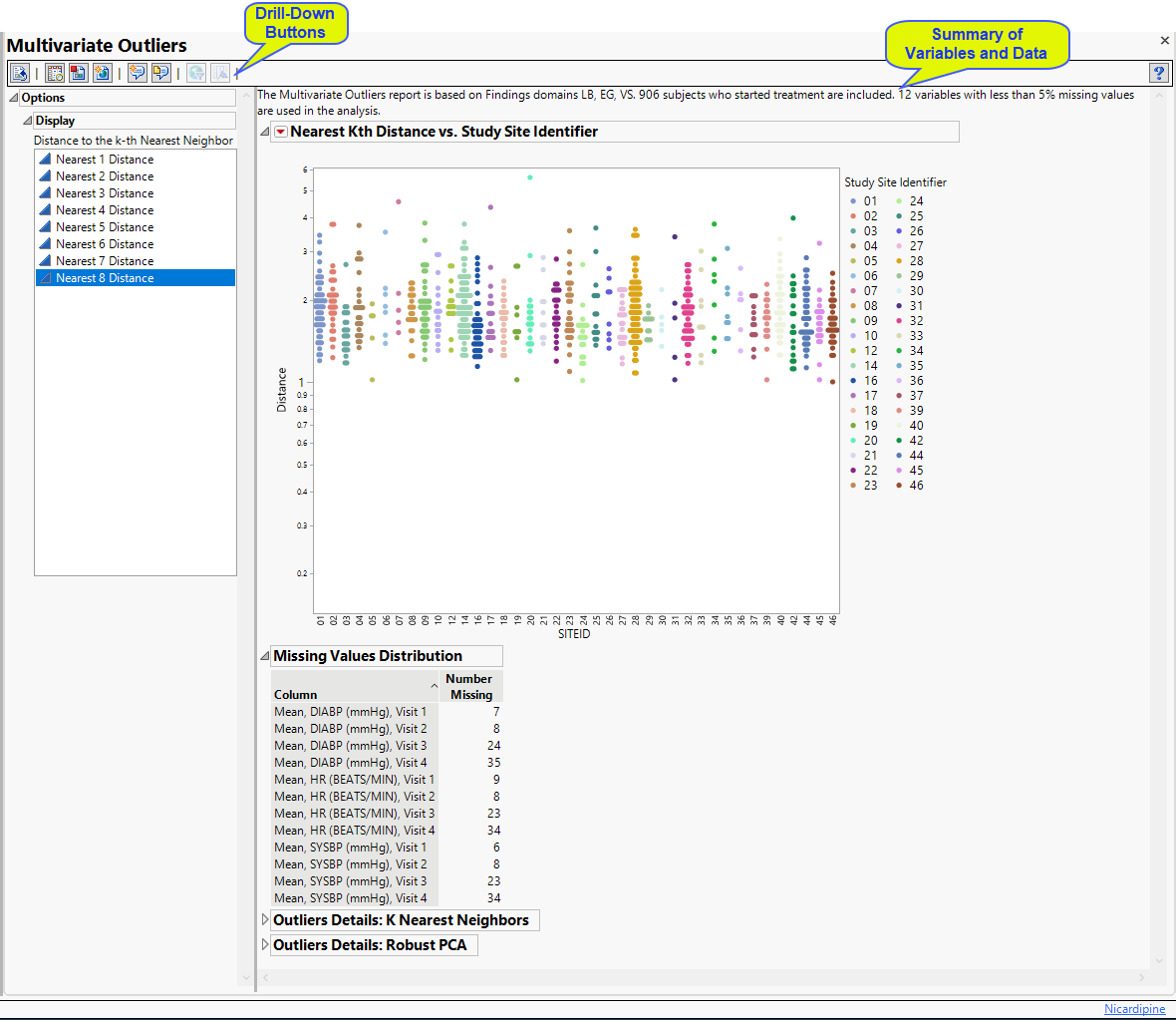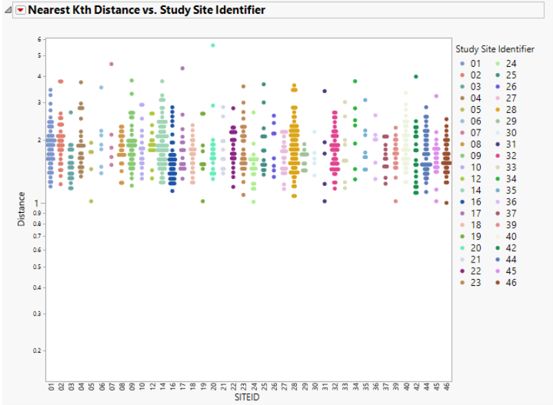 This report attempts to use as much data as possible and takes all findings test codes by visit number for each subject. Of course, doing so can lead to missing data particularly for studies that do not appear to have a fixed number of visits or with lots of dropouts. The Explore Outliers platform's K Nearest Neighbors method uses missing value imputation on variables with fewer than 5% missing values by default, so of the subjects that have fewer than 5% missing values for one of those variables have those values imputed. Scores are computed for those subjects with either complete data or imputed data. Because outlier distance cannot be calculated with lots of missing data present, variables with more than 5% missing values are not considered. Scores are computed for those subjects with either complete data or imputed data. Refer to the JMP Help for Robust PCA Outliers for information on how that method handles missing values.