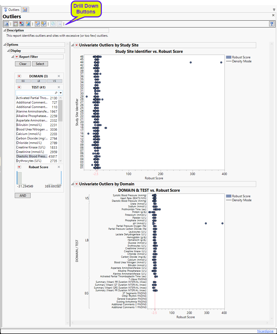 Enables you to filter your data and drill down to look at outliers for specific findings test results. For example, if we click on Hematocrit, we generate the following plots.