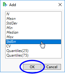 By default if nothing is selected the following statistics are shown: N, Mean, Std Dev, Min, Median, and Max.