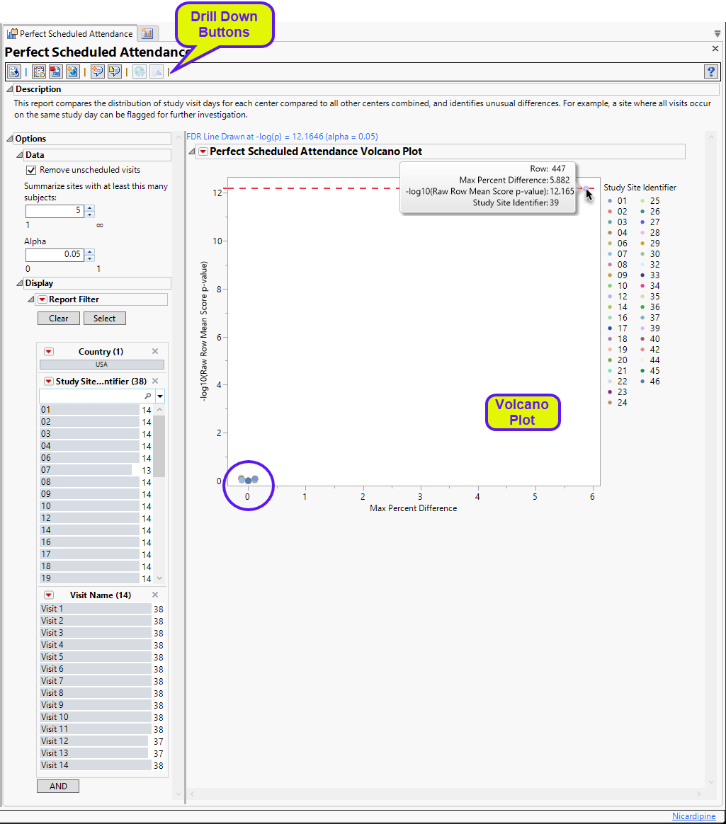 The Perfect Scheduled Attendance report initially shows one Volcano Plot