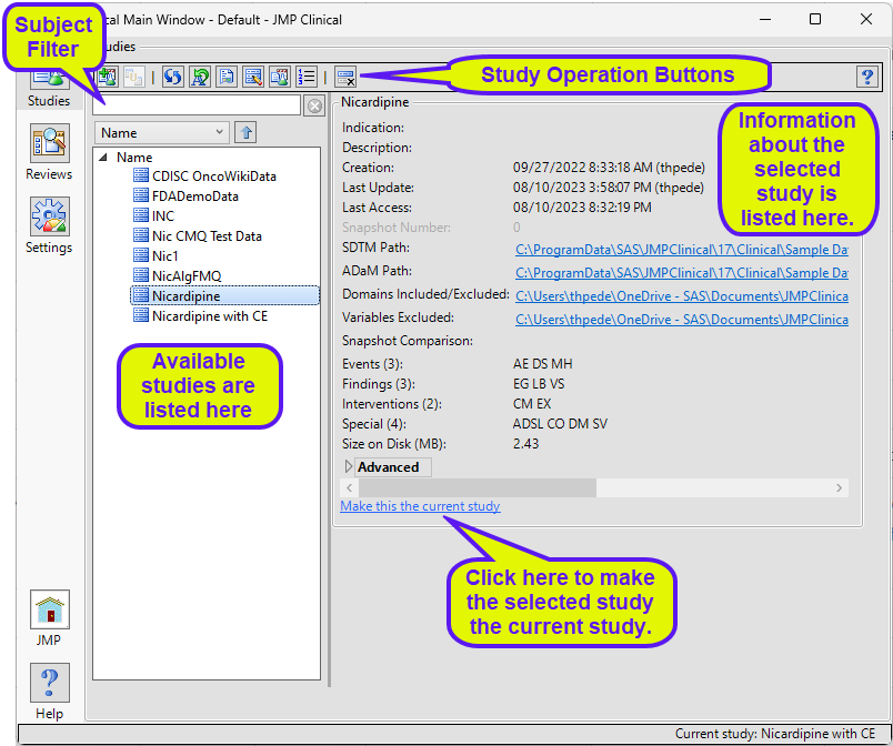 Information about the selected study is shown in the panel on the right side of the window. This includes the date the study was created, when it last updated and when it was last accessed. Additionally, the location of the study data within your file structure is shown along with a list of the domains that make up your study data. In the Nicardipine study shown above, there are 3 events domains (AE, DS, and MH), 3 findings domains (EG, LB, and VS) 2 interventions domains (CM and EX), and three special domains (ADSL, DM, and SV).