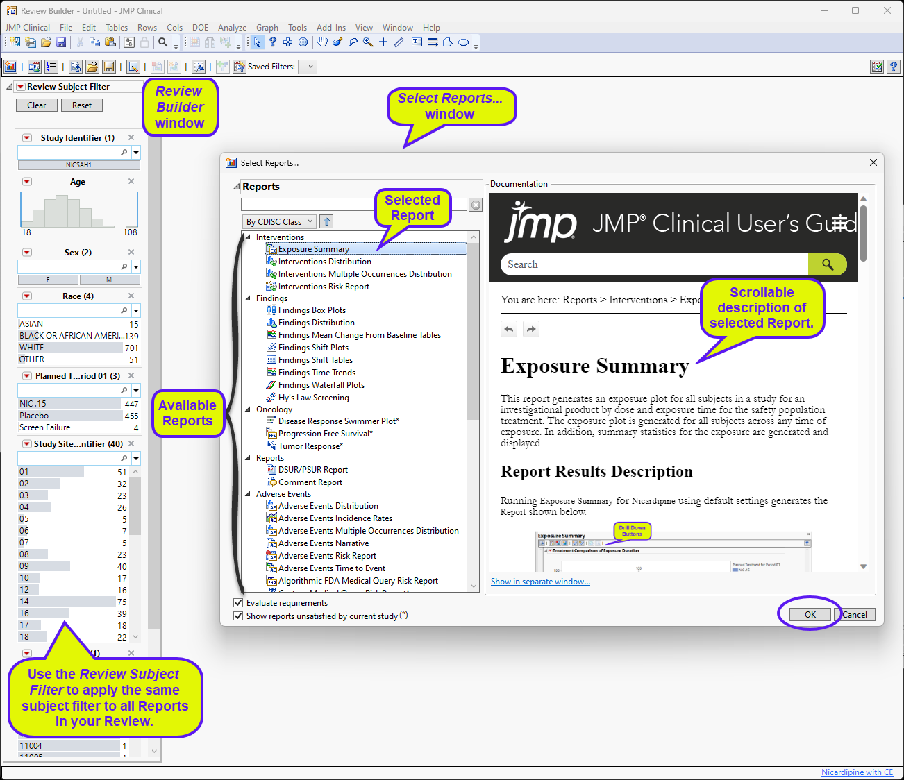 The Select Reports... window lists all of the reports that are available for analyzing the specified study. This window is used to select the reports that are to be included in the review.