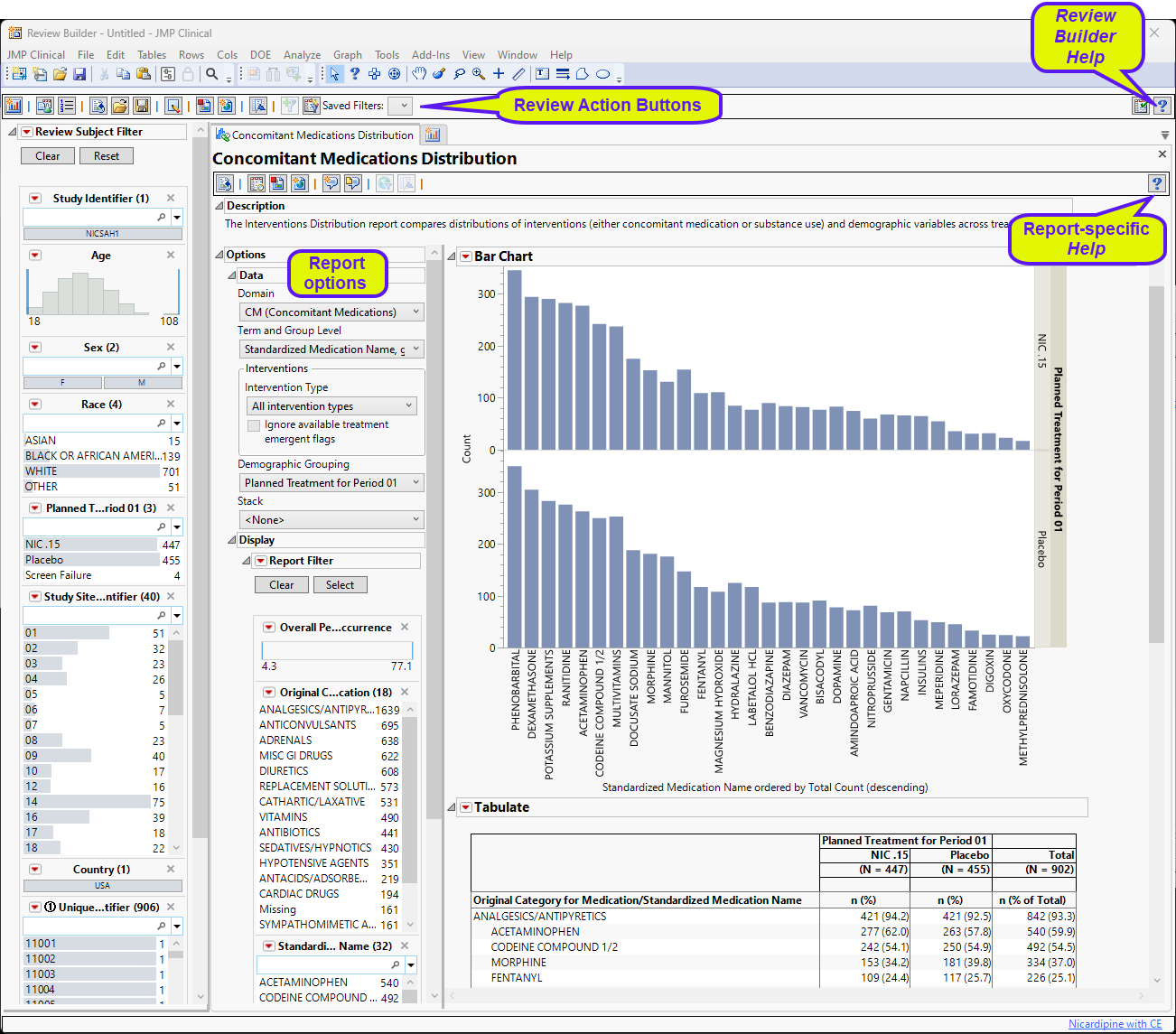 The Review Builder window contains all of the specified reports. There is a separate tab for each report. Initially, each tab lists the options for the analysis. You can accept the default settings or adjust them as desired. After the report(s) is run, results are shown in the tab.