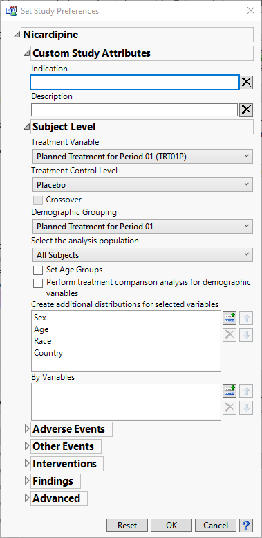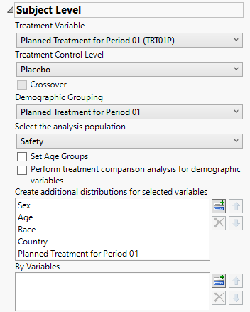 Note: JMP Clinical automatically tries to assign default values for each of the subject level preferences based on flags found in the ADSL, ADDM, or DM (and optionally SUPPDM) data sets as well as prior selections. Use the individual widgets to modify the selections.