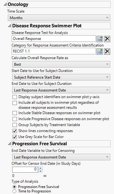 The Offset for Censor End Date (in Study Days) option enables you to specify a minimum time interval following censor end date that can be used to determine whether progression has occurred. Patient who progress within that threshold are considered to have progressed whereas patients who progress after the specified threshold are not.