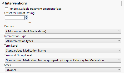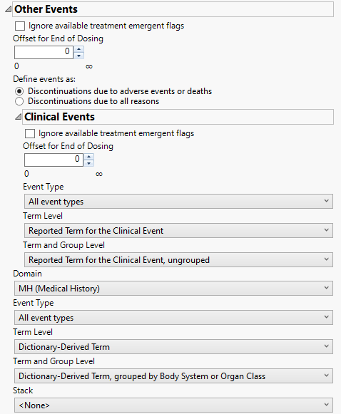 Term and Group Levels are determined by the coding dictionary for the Event or Intervention domain of interest, typically these levels follow the MedDRA dictionary. You must indicate how each adverse event is named and the level at which the event is considered. For example, selecting Reported Term for the Adverse Event, grouped by Body System or Organ Class reports the event specified by the actual event term as reported in the AE domain on the affected organ or body system.