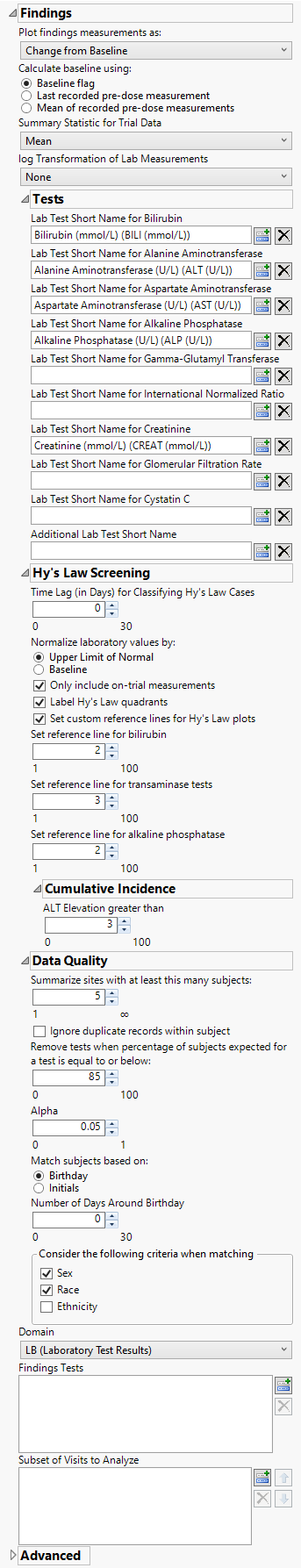 Use the Findings Domain to Analyze option to specify whether to plot the distribution of measurements from either the Electrocardiogram (EG), Laboratory (LB), or Vital Signs (VS) findings domains.