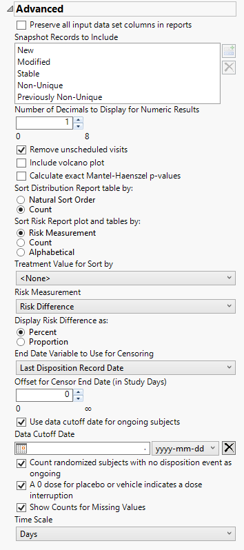 Use the Determine Time at Risk and Adverse Event inclusion from: widget to specify whether JMP Clinical should calculate patient years and event inclusion based on study date variables or from derived patient years/time at risk and event inclusion flags.