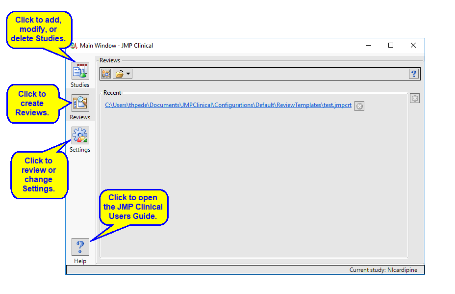 When you open JMP Clinical, the first window you see is the JMP Clinical Main window: