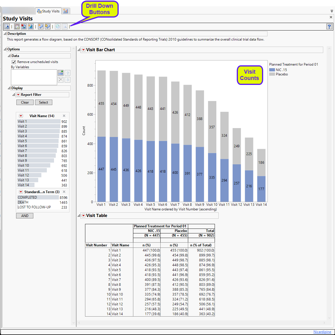 The Study Visits report generates graphical and tabulation displays of study visit attendance. Additionally, a distribution of study days for each specified visit is shown.