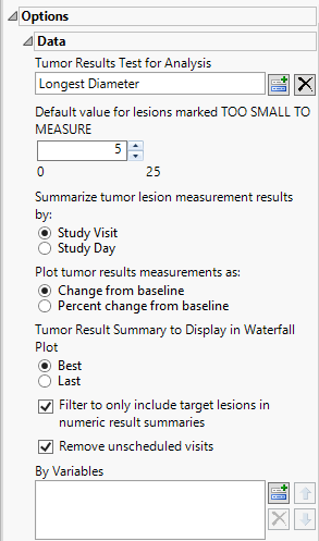 Use Tumor Results Test for Analysis widget to select the test to be used both for creating the summary measurement value to plot by time in the spider plot and to summarize in the waterfall plot where each subject is represented with a bar whose height is determined by the calculated Best or Last value.