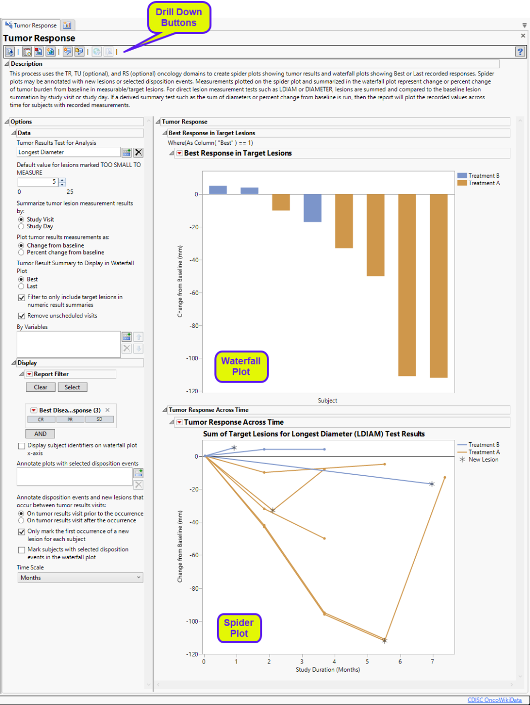 This process uses the TR, TU (optional), and RS (optional) oncology domains to create spider plots showing tumor results and waterfall plots showing Best or Last recorded responses. Spider plots may be annotated with new lesions or selected disposition events. Measurements plotted on the spider plot and summarized in the waterfall plot represent change or percent change of tumor burden from baseline in measurable/target lesions. For direct lesion measurement tests such as LDIAM or DIAMETER, lesions are summed and compared to the baseline lesion summation by study visit or study day. If a derived summary test such as the sum of diameters or percent change from baseline is run, then the report will plot the recorded values across time for subjects with recorded measurements.