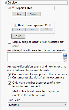 This enables you to subset subjects based on their best disease response and whether or not new lesions were detected. Refer to Data Filter for more information on specifying additional filtering criteria.