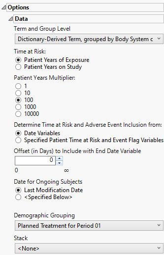 Use this option to specify the number of days after the last date of study or exposure for calculation of patient time at risk and adverse event variable inclusion. Refer to Offset (in Days) to Include with End Date Variable for more information.